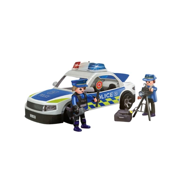 El auto de policía es el protagonista del set: cuenta con luces parpadeantes y efectos de sonido que simulan una verdadera patrulla en acción.