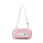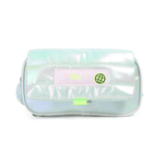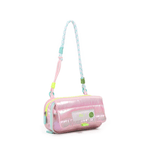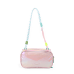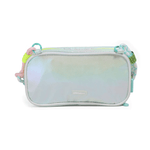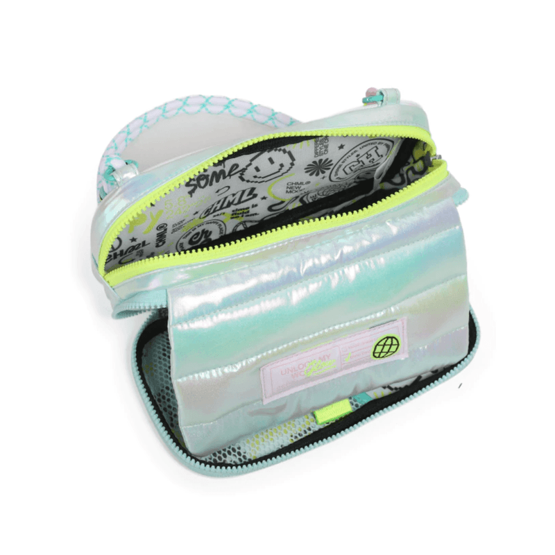 Esta cartuchera combina un diseño acolchado con acabado tornasolado, correa trenzada y detalles neón que la hacen súper original.