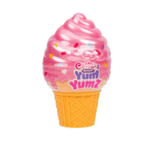 Este producto es parte de la colección Cookeez Makery Yum Yumz, una línea de juguetes sorpresa con temática de postres y animales adorables. El empaque tiene forma de un helado de barquillo con crema rosada y decoraciones de confites de colores, lo que lo hace llamativo y temático.