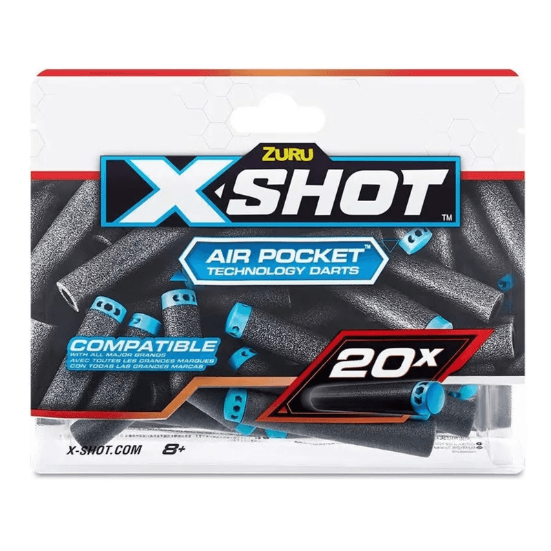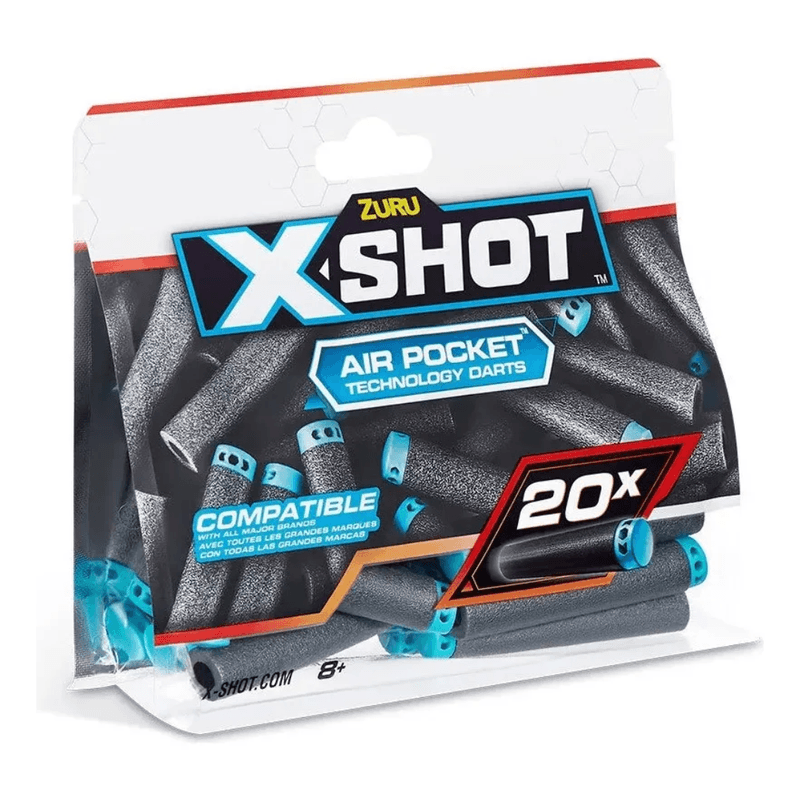 El pack X-Shot Air Pocket Technology Darts incluye 20 dardos de espuma de alto rendimiento, diseñados para lograr mayor alcance, velocidad y precisión en cada disparo.