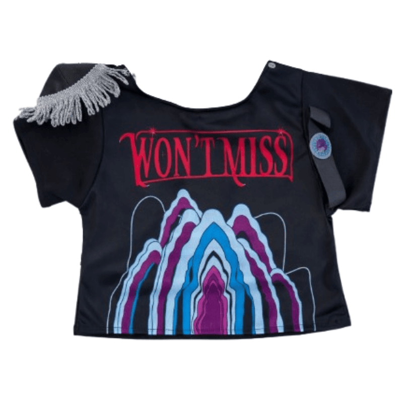 remera, pollera con elástico, collar y hombrera con abrojo, pensados para brindar un look impactante y confortable al mismo tiempo.
