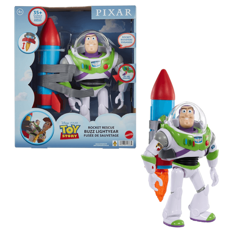 El gran cohete que lleva a la espalda está inspirado en la conmovedora escena en la que Buzz Lightyear acude al rescate de Woody. Un botón en el pecho activa las frases, los sonidos y el efecto de las llamas.