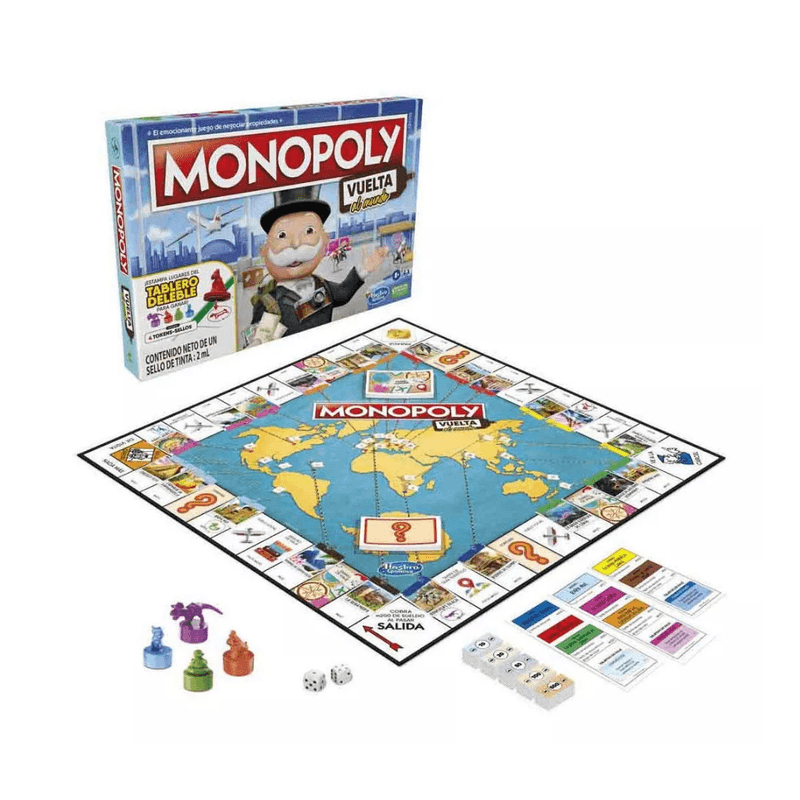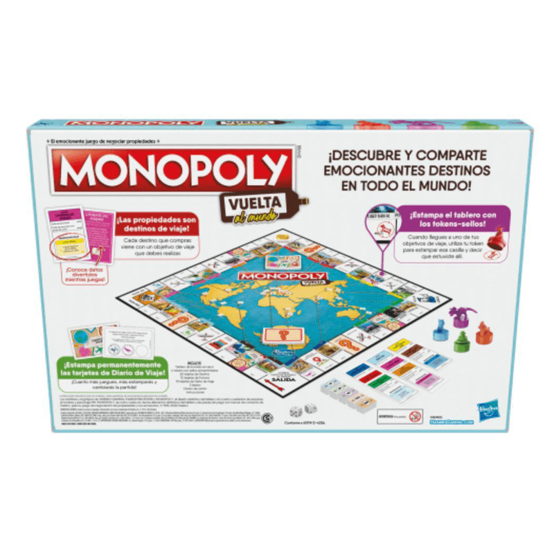 El juego de mesa Monopoly Vuelta al mundo es una versión del clásico juego Monopoly, en el que los jugadores descubren y visitan emocionantes destinos turísticos. Los jugadores compran destinos, realizan objetivos de viaje y estampan el tablero de borrado en seco con su token-sello para ganar. Crea recuerdos con las tarjetas de Diario de Viaje, que formarán parte del juego en futuras partidas, y aprende datos divertidos sobre lugares de todo el mundo por el camino. Ideal para los amantes de los viajes, esta versión de Monopoly es un juego divertido para una noche de juegos en familia y un gran juego para niños a partir de 8 años.