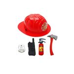 Incluye, casco de juguete de Bomberos para niños regulable, hacha de mano, placa de identificación, handy manual, y matafuegos para la extinción.