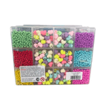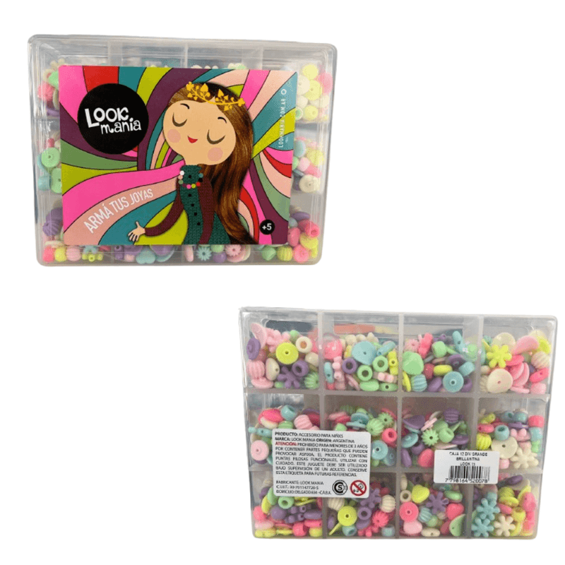 Viene con mostacillas de plástico y tanza.