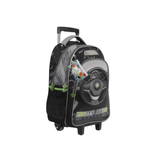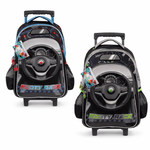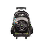 Mochila infantil con carro ideal para el uso escolar diario, diseñada con un impactante diseño F1 Race que simula el tablero y volante de un auto de carrera.