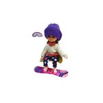 Snowboarder: Tabla colorida, gorro púrpura y suéter blanco.