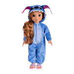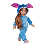 La muñeca luce el clásico look de Stitch con las ICÓNICAS OREJAS y DENTADURA en la abertura de la capucha. La muñeca luce un pelo largo y precioso para peinar a tu gusto. Su cómodo look se complementa con un par de Zapatitos con estampado de flores, un CEPILLO DE DIENTES y una Pasta DENTAL: ¡está lista para una fiesta de pijamas!