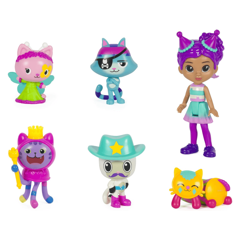 6 FIGURAS DE JUGUETE DE LA CASA DE MUÑECAS DE GABBY: Este juego de figuras de juguete de edición especial con temática de celebración presenta a Gabby Girl, DJ Catnip, Catrat, Pandy Paws, Pillow Cat y Kitty Fairy, para una celebración felina.
