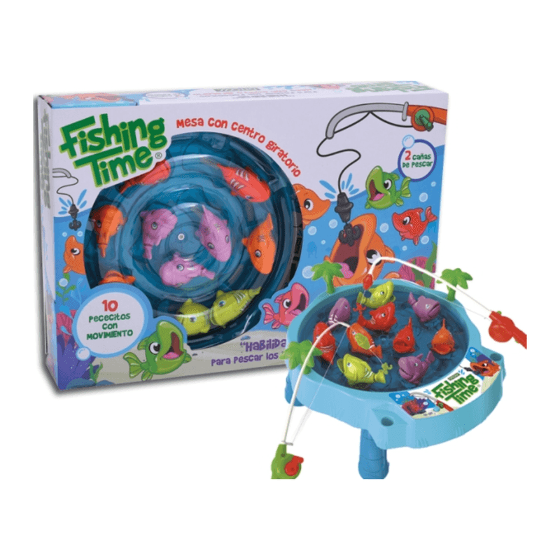 Exclusivo juego de pesca con mesa y centro giratorio, 10 hermosos pececitos giran con movimiento abriendo y cerrando su boca esperando a ser atrapados por la caña