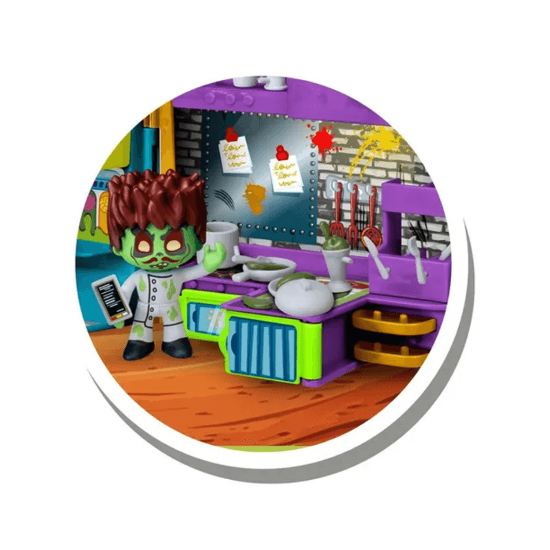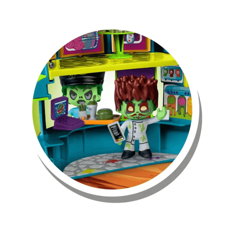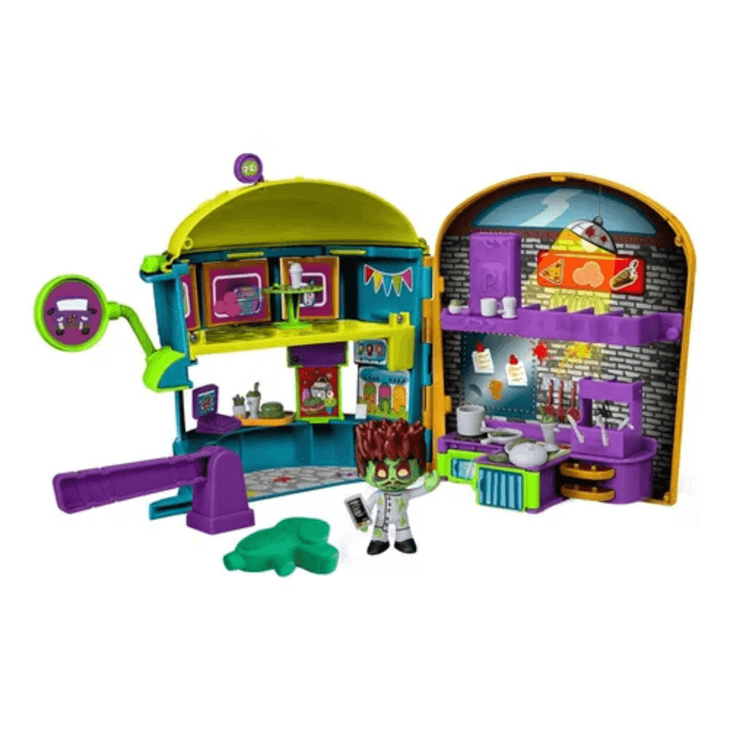 Incluye una figura exclusiva de zombie que cambia de color al contacto con agua fría o caliente, revelando cicatrices sorprendentes. La guarida cuenta con múltiples áreas de juego como un laboratorio de experimentos, cocina mutante, lanzador, y muchos secretos escondidos para descubrir.