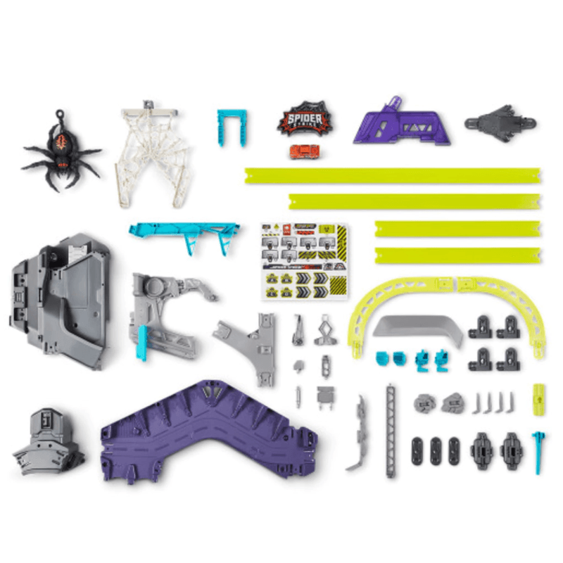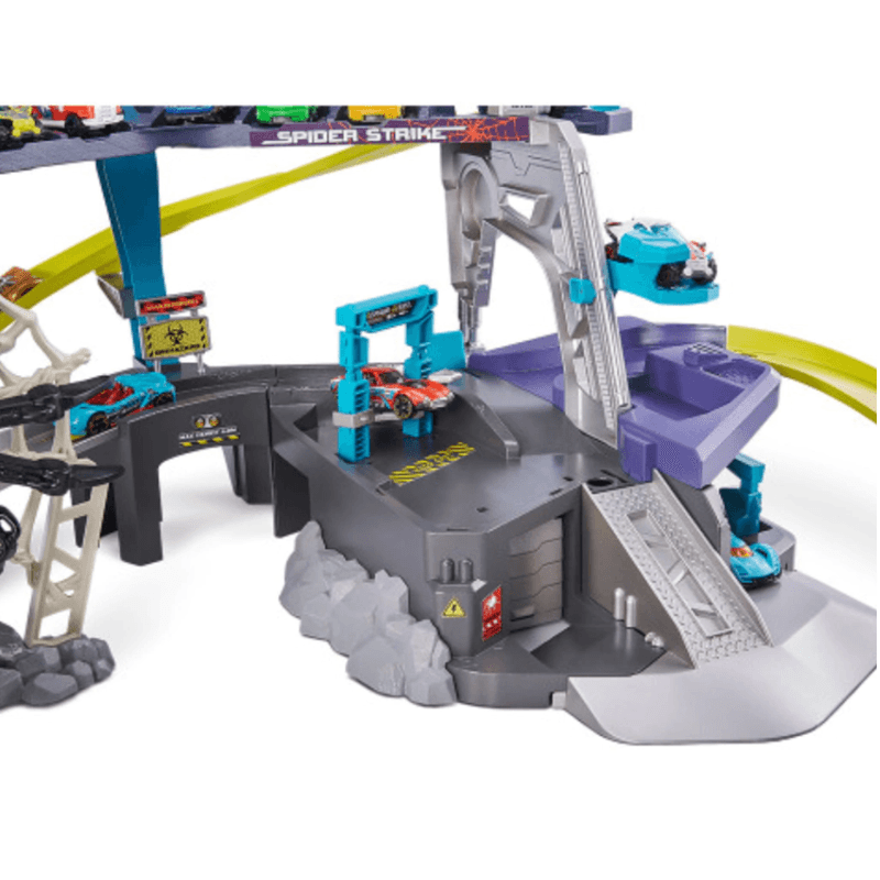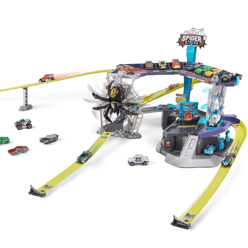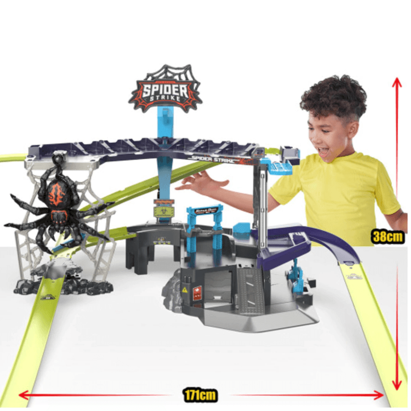 MÁQUINAS METÁLICAS SPIDER STRIKE: lucha contra la monstruosa araña atacante. Este juego incluye una araña gigante que se balancea en su telaraña, ¡asegúrate de cronometrar tu carrera o la araña te detendrá!