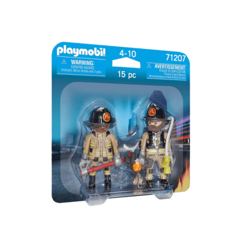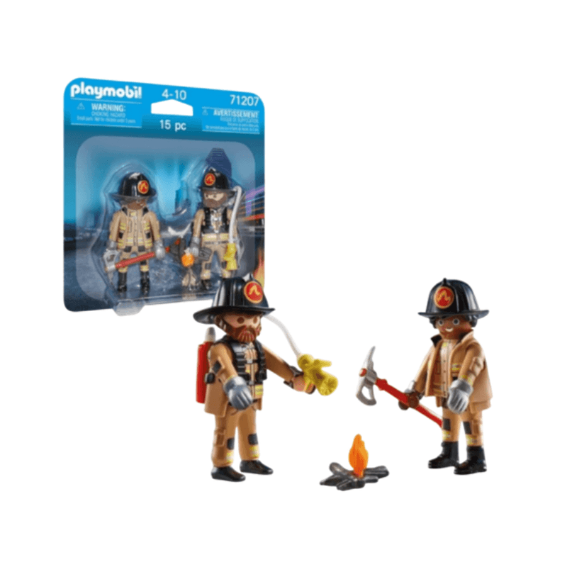 Corre al rescate con el valiente equipo de bomberos de PLAYMOBIL. Con un extintor y un hacha, los bomberos se dirigen a extinguir las llamas. Los guantes y los cascos se pueden quitar.