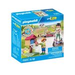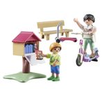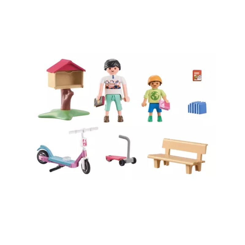 Contenido: 1 figura mujer, 1 figura niño con casco, 1 soporte con casa de animales pequeños, libros, 1 banco, 1 scooter.