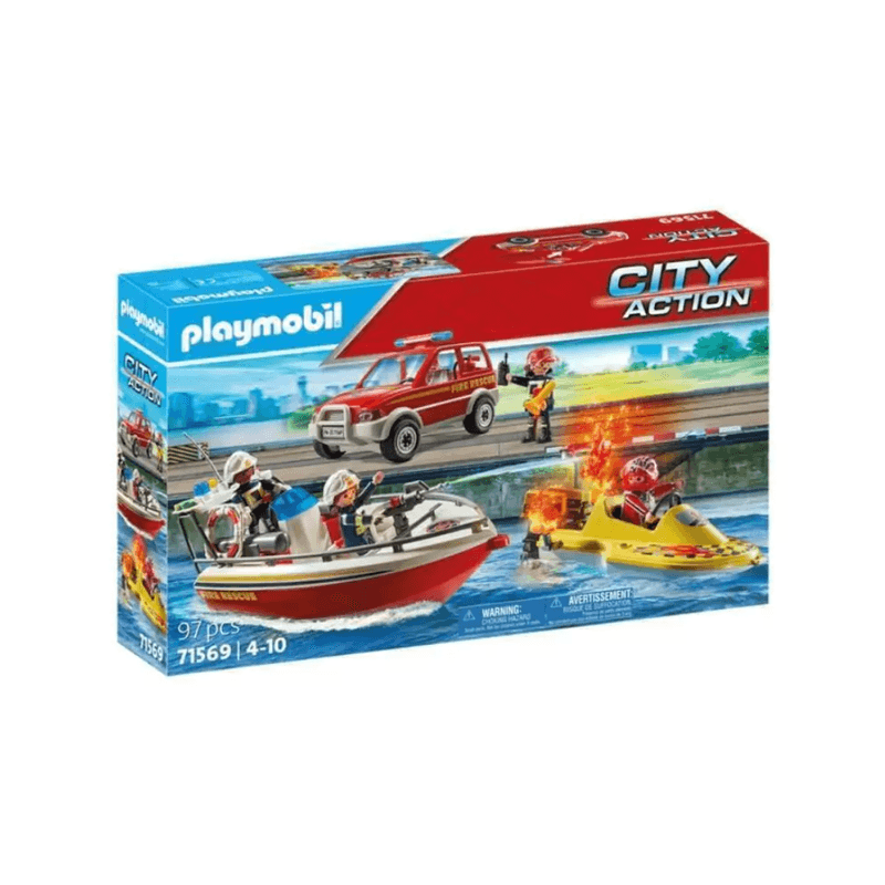 ¡La brigada de bomberos se lanza al rescate con la Misión de Bomberos en el Agua de PLAYMOBIL! Este set acuático es perfecto para los pequeños héroes que sueñan con salvar el día, llevando la acción y la emoción de los bomberos al agua.