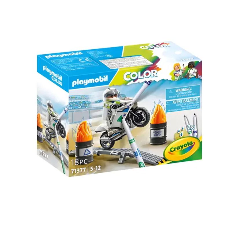En colaboración con la creativa compañía CRAYOLA, los niños pueden pintar una y otra vez a sus figuras favoritas. Los sets personalizables de PLAYMOBIL Color fomentan de manera lúdica la creatividad y las habilidades motoras finas de los pequeños fans del bricolaje. Los amantes de las motocicletas pueden emocionarse con una moto que se puede embellecer para el próximo espectáculo acrobático. ¡Un vehículo así es único!