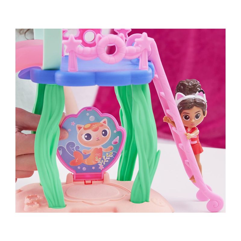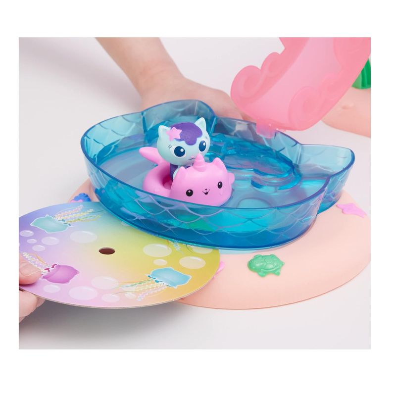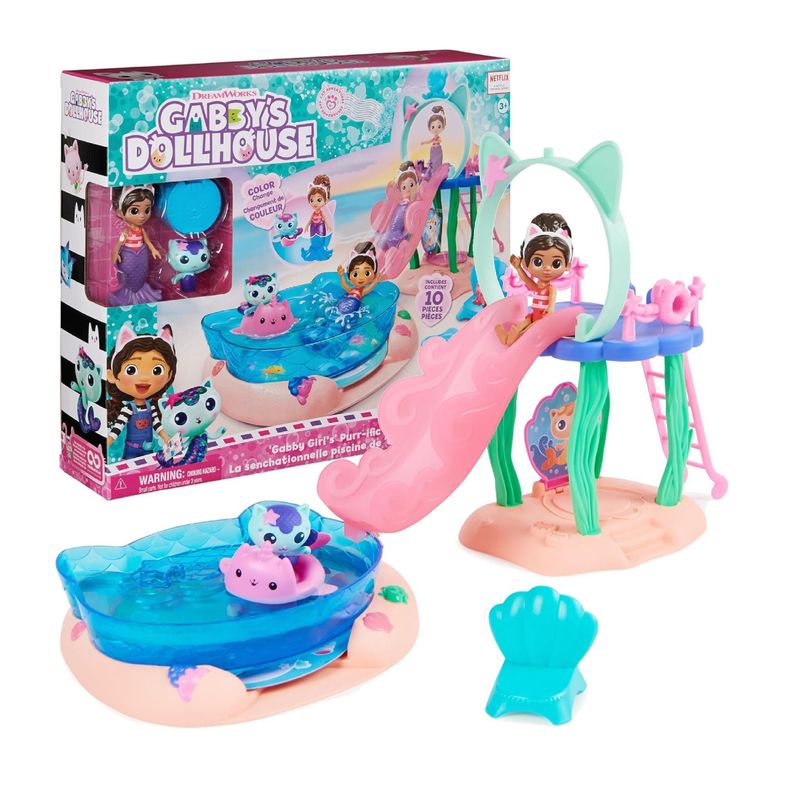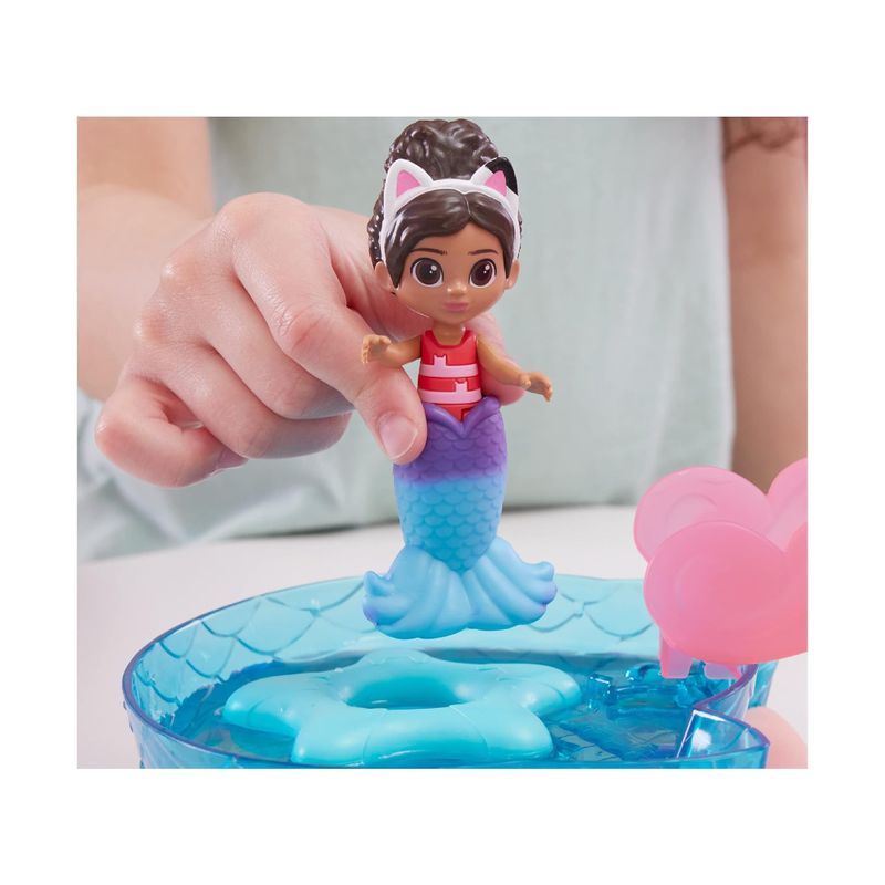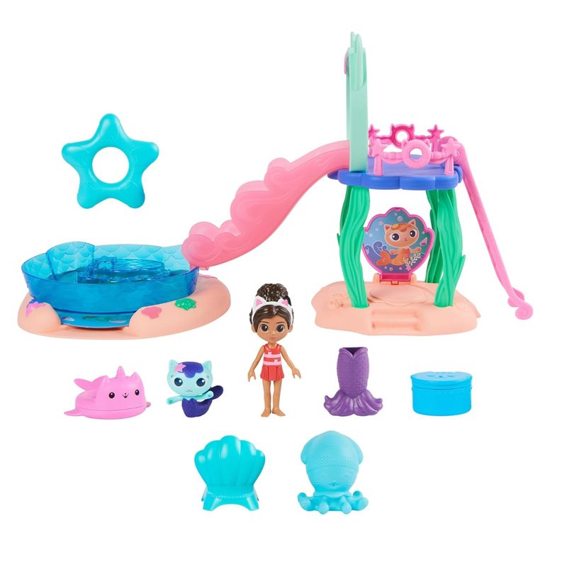 Incluye: 1 juego, 1 figura Gabby, 1 figura MerCat, 1 cola de sirena, 3 accesorios de piscina, 1 almeja de apertura, 1 entrega de casa de muñecas, 1 pulpo-gato, 1 disco de arte con chips