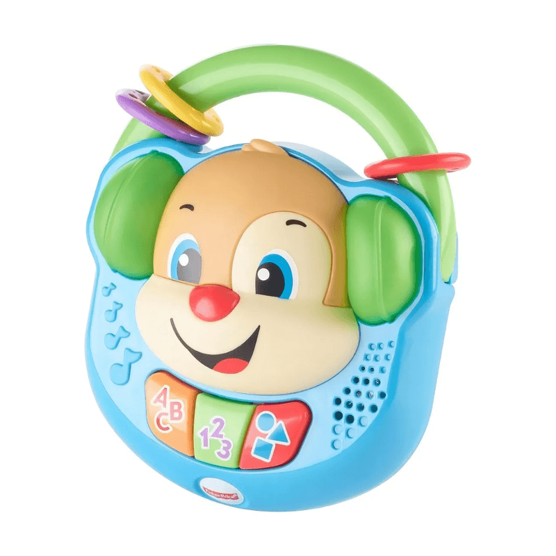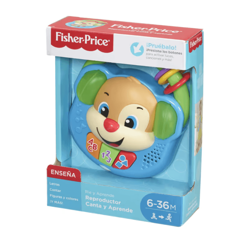 ¡Perrito está listo para bailar y cuenta con la selección musical para hacer bailar a tu bebé! Con presionar uno de los tres botones de colores, el Reproductor Canta y Aprende, de Ríe y Aprende, cobra vida con luces, canciones y frases que enseñan el abecedario, las figuras, los colores y los números.