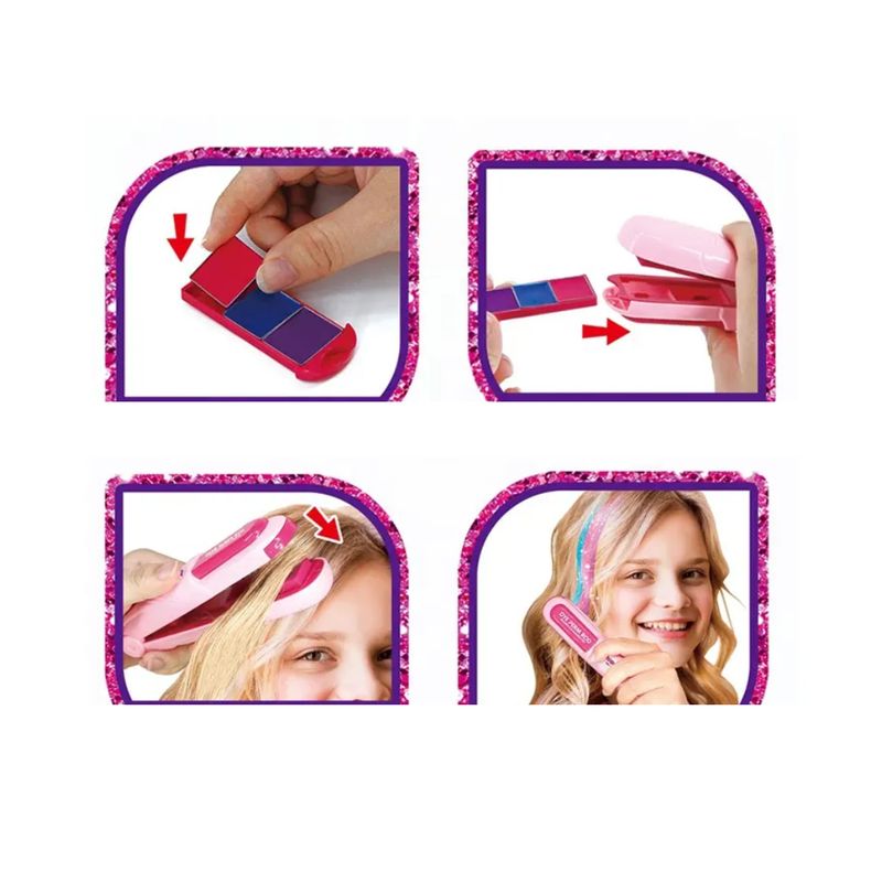 Además, el set viene con un peine que facilitará el peinado y el arreglo del cabello, mientras que las tinturas de colores permitirán a los niños experimentar con diferentes tonos y estilos, todo de manera segura y divertida.