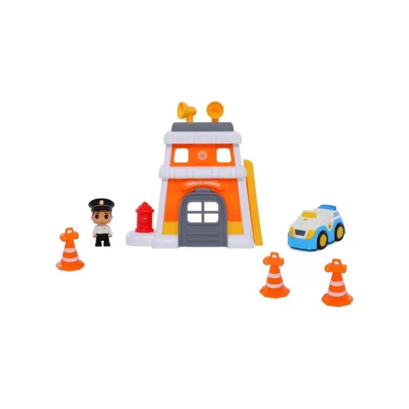 Te presentamos el set de Vehículos My Little Kids. Este conjunto incluye una estación de bomberos y una estación de policía, junto con vehículos y accesorios. El set viene con dos figuras de personajes, un auto de policía y un camión de bomberos.