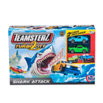 ¡Viaja a la era prehistórica con el Playset de Pista Recta y 2 Vehículos Ataque de Dinosaurios y Tiburón de Teamsterz! Con una pista recta y dos vehículos temáticos