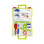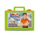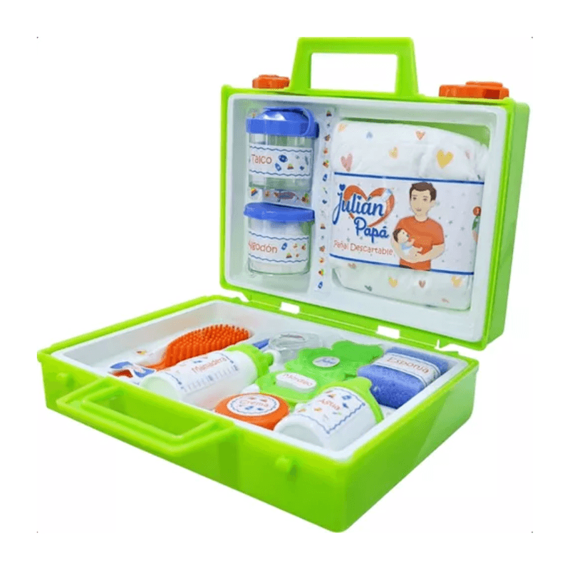 ¡Descripción del producto • Valija Julián papá • Marca: Juliana • Contiene pañal, talco, algodón, mamadera, mordillo, agua, crema, esponja, peine, cepillo, frasco con forma de corazón. • Medida de la valija: 14 cm x 19,5 cm x 7 cm • Edad recomendada: +3 años