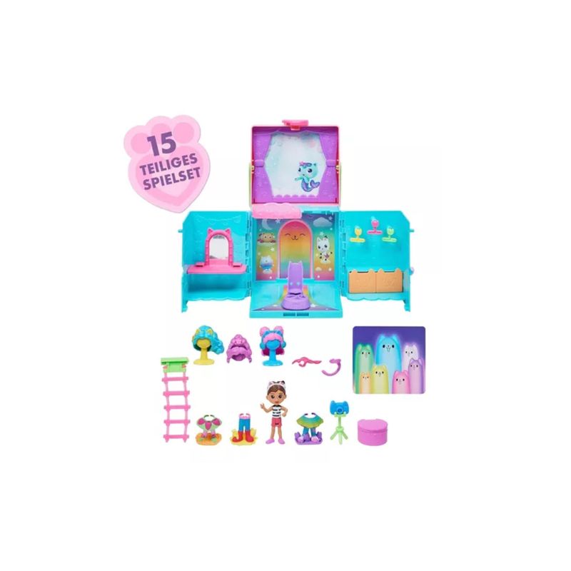 -Contenido: 1 juego portátil, 1 figura de Gabby, 1 escalera de cuerda, 2 soportes para pelucas, 1 cámara, 1 trípode, 9 accesorios, 2 fondos de doble cara con elementos decorativos, 1 caja sorpresa de casa de muñecas, 1 manual de instrucciones